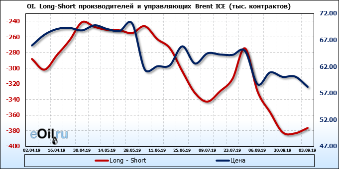 За прошлую неделю, 28.08.19 — 03.09.19, разница между длинными и короткими позициями производителей упала на 12 тыс. контрактов. В тоже время, цена упала на 1.94 доллара. Производители наращивают короткие позиции, что не дает цене расти. В такой ситуации на рынке возможно ускорение падения цен.