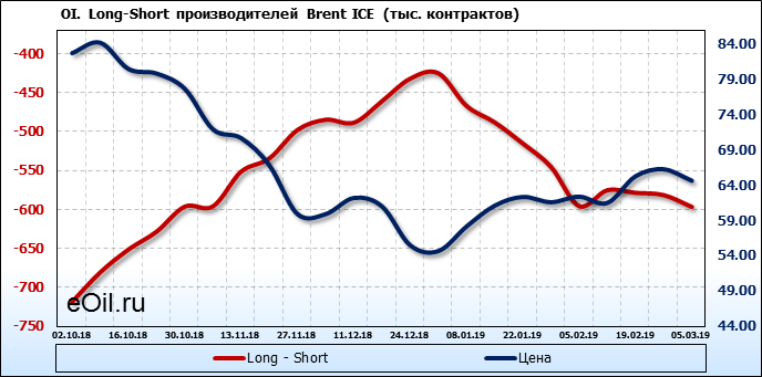 За прошлую неделю, 27.02.19 — 05.03.19, разница между длинными и короткими позициями производителей упала на 15 тыс. контрактов. В тоже время, цена упала на 1.63 доллара. Производители наращивают короткие позиции, что не дает цене расти. В такой ситуации на рынке возможно ускорение падения цен.
