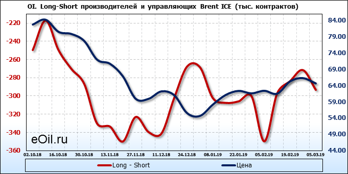 За прошлую неделю, 27.02.19 — 05.03.19, разница между длинными и короткими позициями управляющих упала на 7 тыс. контрактов. В тоже время, цена упала на 1.63 доллара. Наращивание коротких позиций спекулянтами приводит к падению цен. Если давление со стороны медведей продолжится, то мы можем увидеть новые минимумы.