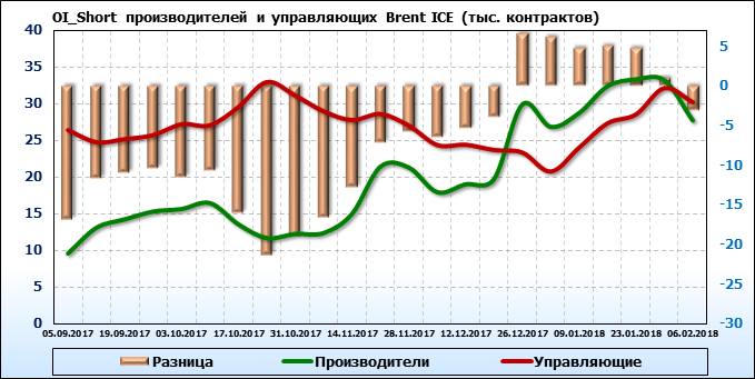 За прошедшую неделю разница между OI производителей и OI управляющих сократилась на 6 459 контрактов. Разница между длинными позициями производителей и управляющих сократилась на 2 486 контрактов. Разница между короткими позициями производителей и управляющих сократилась на 4 007 контрактов.