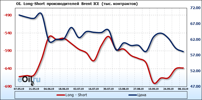 За прошлую неделю, 02.10.19 — 08.10.19, разница между длинными и короткими позициями производителей выросла на 2 тыс. контрактов. В тоже время, цена упала на 1.05 доллара. Производители перестали наращивать короткие позиции, что говорит или о непривлекательности текущих ценовых уровней для хеджирования, или о том, что часть участников рынка заняла выжидательную позицию.