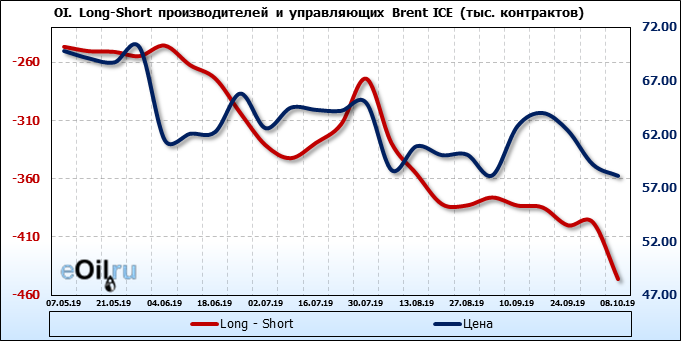 За прошлую неделю, 02.10.19 — 08.10.19, разница между длинными и короткими позициями управляющих упала на 51 тыс. контрактов. В тоже время, цена упала на 1.05 доллара. Наращивание коротких позиций спекулянтами приводит к падению цен. Если давление со стороны медведей продолжится, то мы можем увидеть новые минимумы.