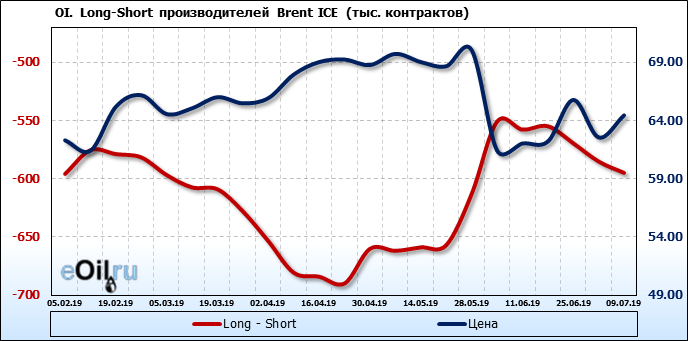 За прошлую неделю, 03.07.19 — 09.07.19, разница между длинными и короткими позициями производителей и управляющих упала на 11 тыс. контрактов. За отчетный период времени, цена выросла на 1.9 доллара. Разница совокупного объема длинных и коротких позиций производителей и управляющих на прошедшей неделе снизилась, в то время как цены выросли. Рынок теряет доверие покупателей, что, при продолжении данной динамики, приведет к стабилизации или падению цен в ближайшее время.