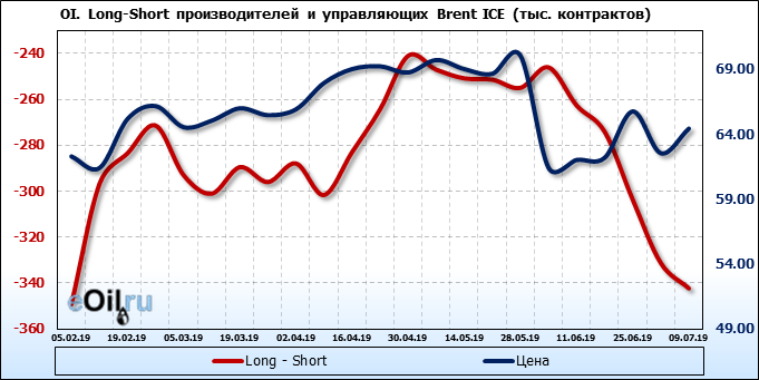 За прошлую неделю, 03.07.19 — 09.07.19, разница между длинными и короткими позициями управляющих упала на 1 тыс. контрактов. В тоже время, цена выросла на 1.9 доллара. Управляющие не горят желанием покупать, что заставляет нас рассуждать о потери доверия к тенденции со стороны быков — спекулянтов. Рынок становится более тонким. Без прихода свежих объемов, толкать цену вверх скоро будет некому.