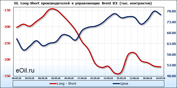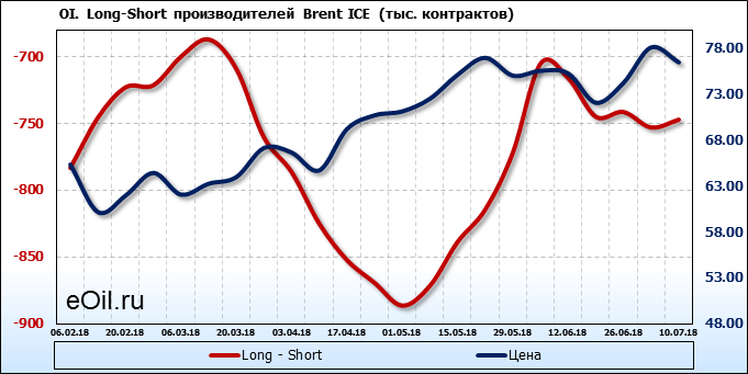 За прошлую неделю, 02.07.18 — 06.07.18, разница между длинными и короткими позициями производителей выросла на 6 тыс. контрактов. В тоже время, цена упала на 1.62 доллара. Производители перестали наращивать короткие позиции, что говорит или о непривлекательности текущих ценовых уровней для хеджирования, или о том, что часть участников рынка заняла выжидательную позицию.
