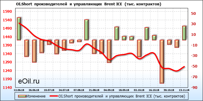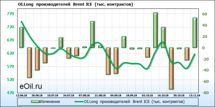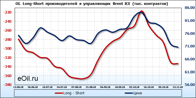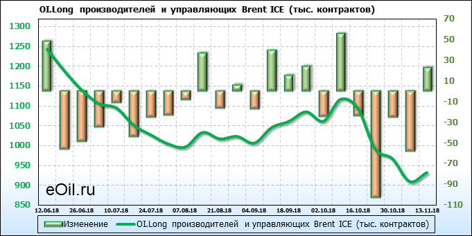 За прошлую неделю, 07.11.18 — 13.11.18, разница между длинными и короткими позициями производителей выросла на 45 тыс. контрактов. В тоже время, цена упала на 1.24 доллара. Производители перестали наращивать короткие позиции, что говорит или о непривлекательности текущих ценовых уровней для хеджирования, или о том, что часть участников рынка заняла выжидательную позицию.