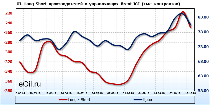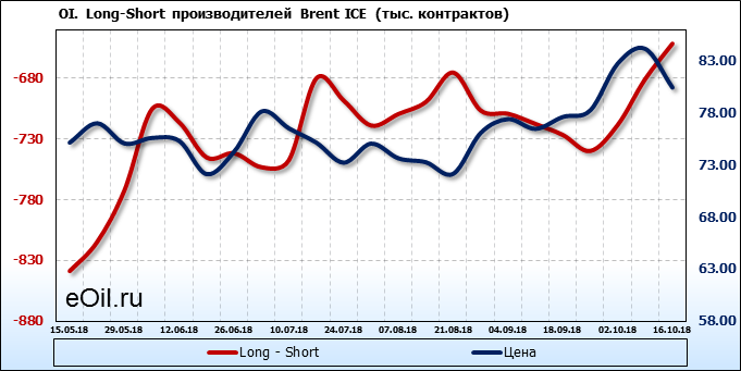 За прошлую неделю, 10.10.18 — 16.10.18, разница между длинными и короткими позициями производителей выросла на 29 тыс. контрактов. В тоже время, цена упала на 3.73 доллара. Производители перестали наращивать короткие позиции, что говорит или о непривлекательности текущих ценовых уровней для хеджирования, или о том, что часть участников рынка заняла выжидательную позицию.