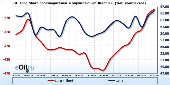 За прошлую неделю, 11.12.19 — 17.12.19, разница между длинными и короткими позициями управляющих выросла на 34 тыс. контрактов. В тоже время, цена выросла на 1.66 доллара. Управляющие наращивают позиции, разгоняя тем самым рост цен, что говорит нам о текущей силе рынка.