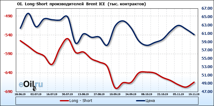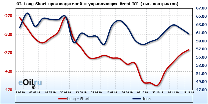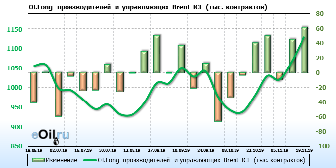 За прошлую неделю, 13.11.19 — 19.11.19, разница между длинными и короткими позициями производителей выросла на 13 тыс. контрактов. В тоже время, цена упала на 1.28 доллара. Производители перестали наращивать короткие позиции, что говорит или о непривлекательности текущих ценовых уровней для хеджирования, или о том, что часть участников рынка заняла выжидательную позицию.