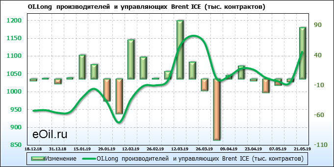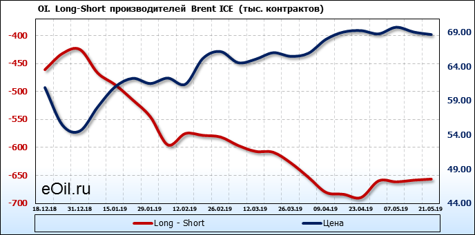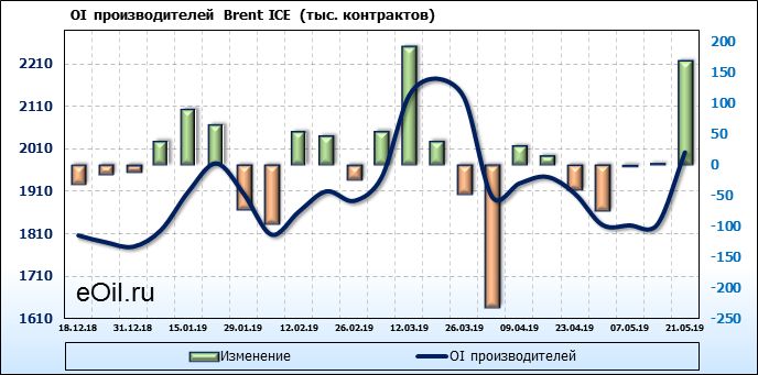 За прошлую неделю, 15.05.19 — 21.05.19, разница между длинными и короткими позициями производителей выросла на 2 тыс. контрактов. В тоже время, цена упала на 0.36 доллара. Производители перестали наращивать короткие позиции, что говорит или о непривлекательности текущих ценовых уровней для хеджирования, или о том, что часть участников рынка заняла выжидательную позицию.