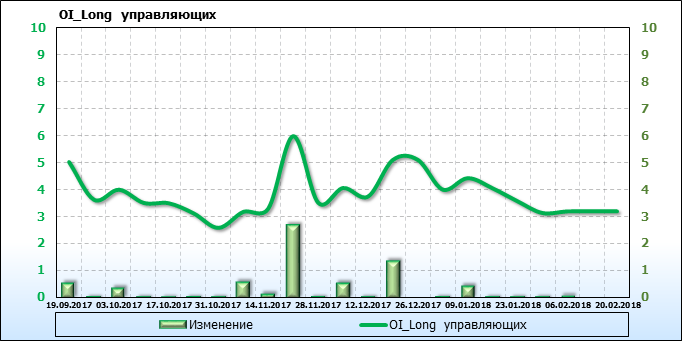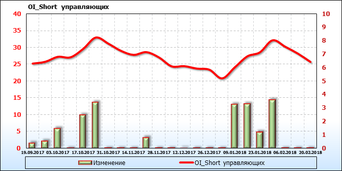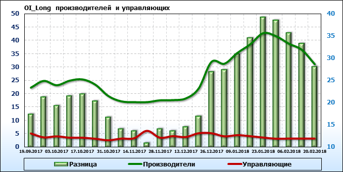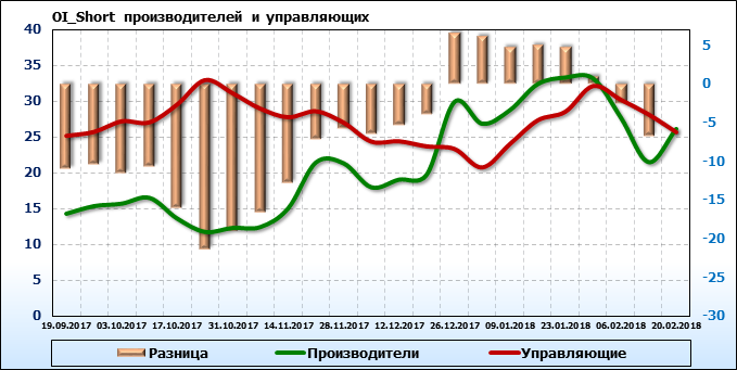 За прошедшую неделю разница между OI производителей и OI управляющих выросла на 492 контракта. Разница между длинными позициями производителей и управляющих сократилась на 5 303 контракта. Разница между короткими позициями производителей и управляющих выросла на 6 692 контракта.
