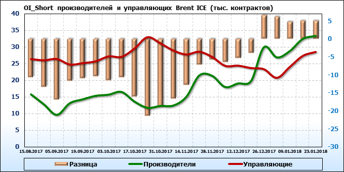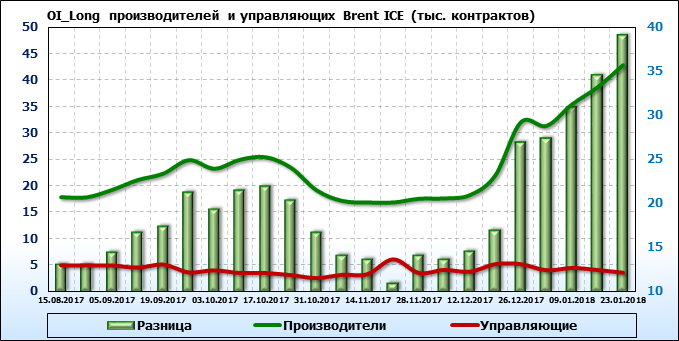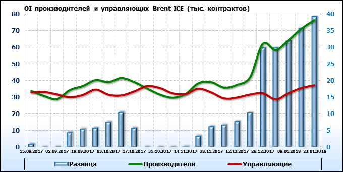 За прошедшую неделю разница между OI производителей и OI управляющих выросла на 3 452 контракта. Разница между длинными позициями производителей и управляющих выросла на 4 469 контрактов. Разница между короткими позициями производителей и управляющих сократилась на 37 контрактов.
