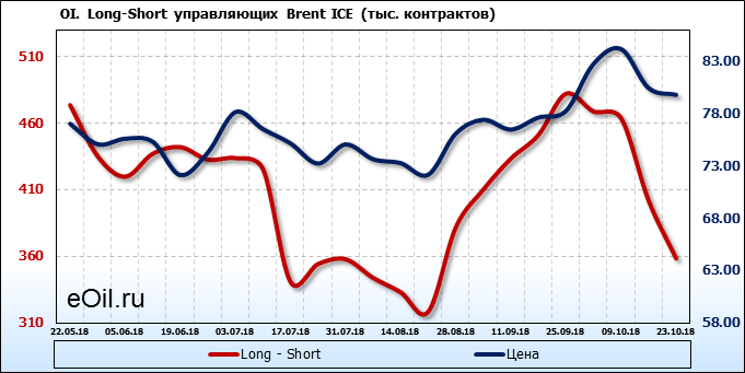 За прошлую неделю, 17.10.18 — 23.10.18, разница между длинными и короткими позициями управляющих упала на 44 тыс. контрактов. В тоже время, цена упала на 0.65 доллара. Наращивание коротких позиций спекулянтами приводит к падению цен. Если давление со стороны медведей продолжится, то мы можем увидеть новые минимумы.