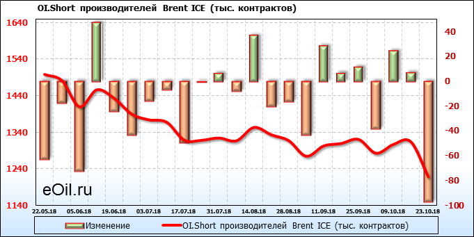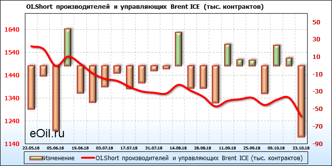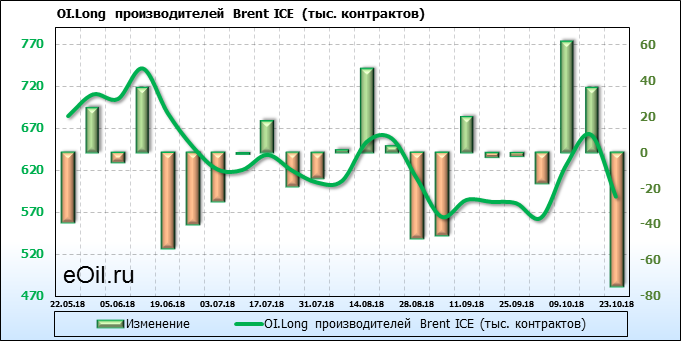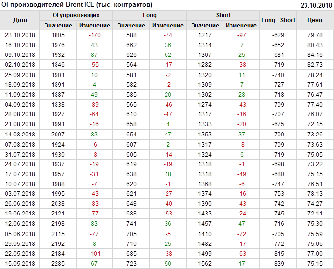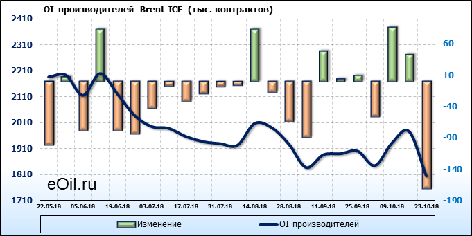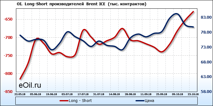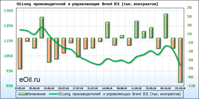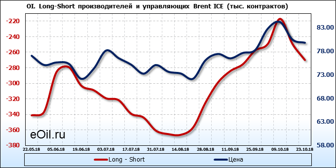 За прошлую неделю, 17.10.18 — 23.10.18, разница между длинными и короткими позициями производителей выросла на 23 тыс. контрактов. В тоже время, цена упала на 0.65 доллара. Производители перестали наращивать короткие позиции, что говорит или о непривлекательности текущих ценовых уровней для хеджирования, или о том, что часть участников рынка заняла выжидательную позицию.