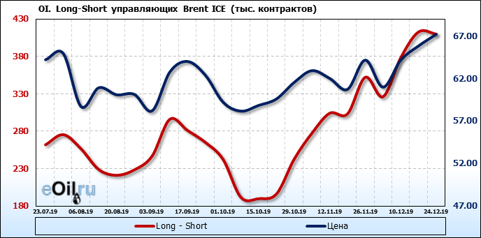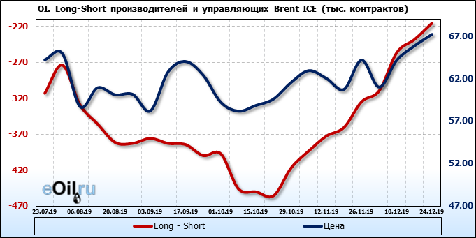За прошлую неделю, 18.12.19 — 24.12.19, разница между длинными и короткими позициями управляющих упала на 3 тыс. контрактов. В тоже время, цена выросла на 1.37 доллара. Управляющие не горят желанием покупать, что заставляет нас рассуждать о потери доверия к тенденции со стороны быков — спекулянтов. Рынок становится более тонким. Без прихода свежих объемов, толкать цену вверх скоро будет некому.
