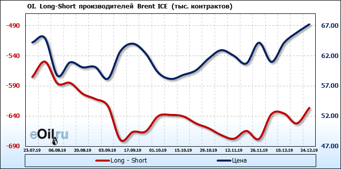 За прошлую неделю, 18.12.19 — 24.12.19, разница между длинными и короткими позициями производителей выросла на 26 тыс. контрактов. В тоже время, цена выросла на 1.37 доллара. Производители не торопятся наращивать продажи, предполагая, что возможен рост цены в ближайшее время.