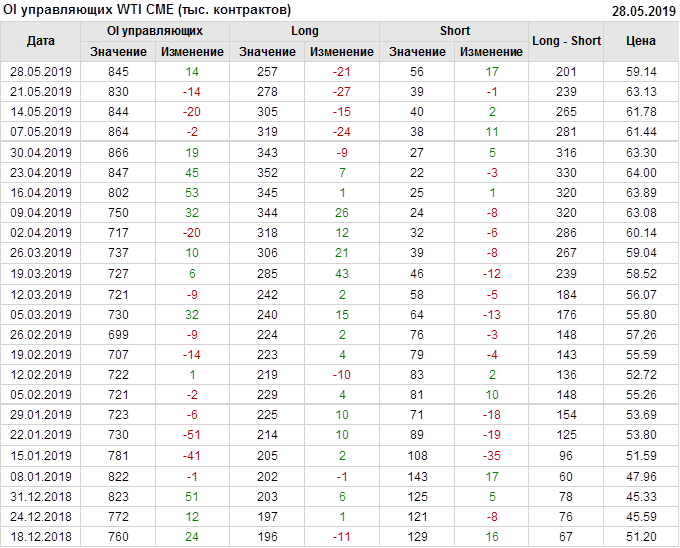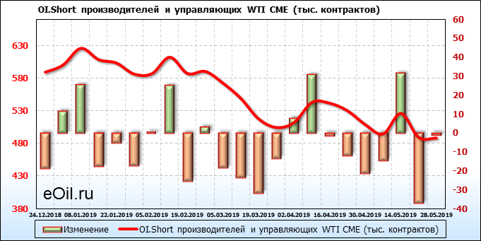 За прошлую неделю, 22.05.19 — 28.05.19, разница между длинными и короткими позициями производителей и управляющих упала на 18 тыс. контрактов. За отчетный период времени, цена упала на 3.99 доллара. Производители и управляющие на отчетной недели были склонны продавать. Суммарное число шортов было выше суммарного числа лонгов. Цены также снижаются, что создает привлекательные условия для продавцов в среднесрочной перспективе, одна — две недели.