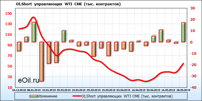 За прошлую неделю, 22.05.19 — 28.05.19, разница между длинными и короткими позициями управляющих упала на 37 тыс. контрактов. В тоже время, цена упала на 3.99 доллара. Наращивание коротких позиций спекулянтами приводит к падению цен. Если давление со стороны медведей продолжится, то мы можем увидеть новые минимумы.