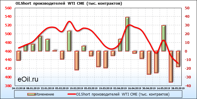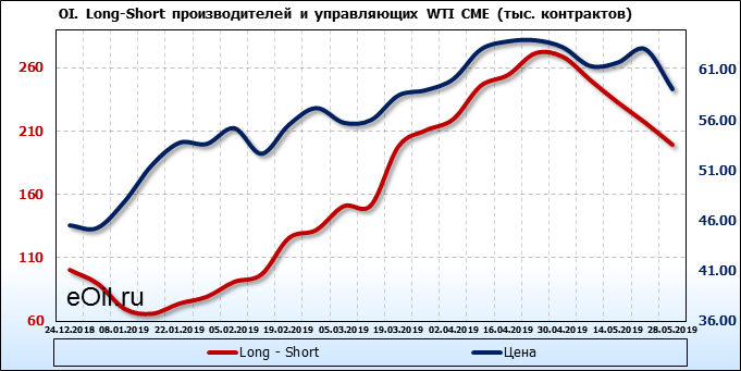 За прошлую неделю, 22.05.19 — 28.05.19, разница между длинными и короткими позициями производителей выросла на 20 тыс. контрактов. В тоже время, цена упала на 3.99 доллара. Производители перестали наращивать короткие позиции, что говорит или о непривлекательности текущих ценовых уровней для хеджирования, или о том, что часть участников рынка заняла выжидательную позицию.