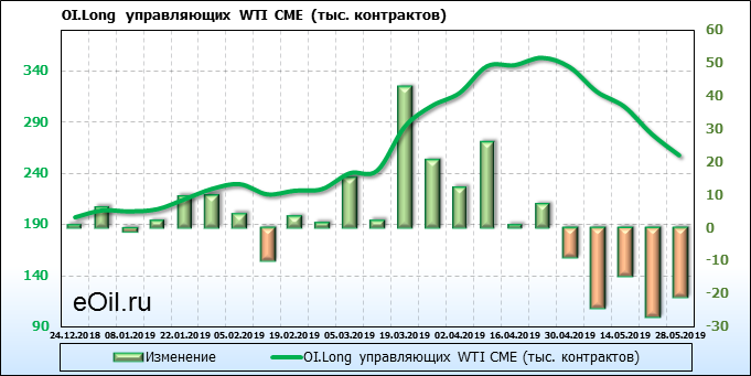 За прошлую неделю, 22.05.19 — 28.05.19, разница между длинными и короткими позициями управляющих упала на 37 тыс. контрактов. В тоже время, цена упала на 3.99 доллара. Наращивание коротких позиций спекулянтами приводит к падению цен. Если давление со стороны медведей продолжится, то мы можем увидеть новые минимумы.