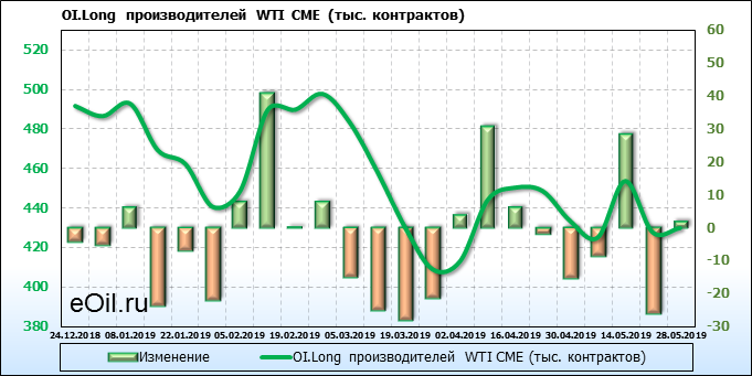За прошлую неделю, 22.05.19 — 28.05.19, разница между длинными и короткими позициями производителей выросла на 20 тыс. контрактов. В тоже время, цена упала на 3.99 доллара. Производители перестали наращивать короткие позиции, что говорит или о непривлекательности текущих ценовых уровней для хеджирования, или о том, что часть участников рынка заняла выжидательную позицию.