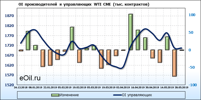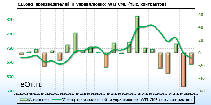 За прошлую неделю, 22.05.19 — 28.05.19, разница между длинными и короткими позициями производителей и управляющих упала на 18 тыс. контрактов. За отчетный период времени, цена упала на 3.99 доллара. Производители и управляющие на отчетной недели были склонны продавать. Суммарное число шортов было выше суммарного числа лонгов. Цены также снижаются, что создает привлекательные условия для продавцов в среднесрочной перспективе, одна — две недели.