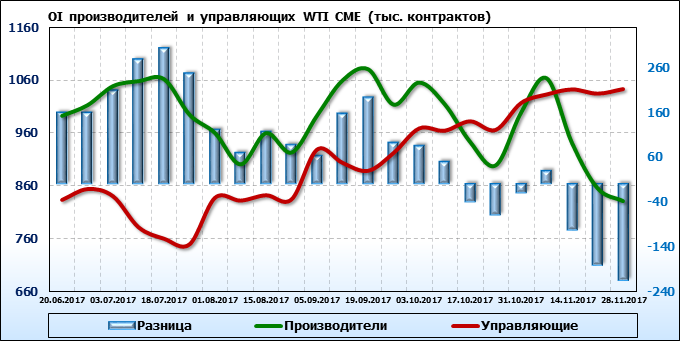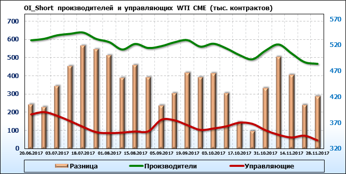 За прошедшую неделю разница между OI производителей и OI управляющих сократилась на 33 011 контрактов. Разница между длинными позициями производителей и управляющих сократилась на 47 952 контракта. Разница между короткими позициями производителей и управляющих выросла на 16 721 контракт.