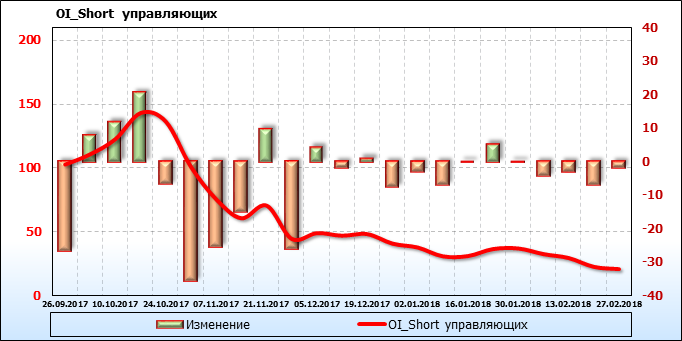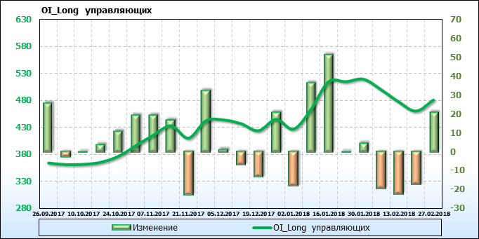 Открытый интерес управляющих активами без учета объема торговцев занимающих противоположные позиции по фьючерсным контрактам с разной датой экспирации вырос на 11 тысяч контрактов. Объем контрактов, направленных как правило на спекуляции, составляет 1 046 369 штук. Деньги управляющих в течение прошлой недели приходили на рынок поддерживая тенденцию.