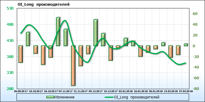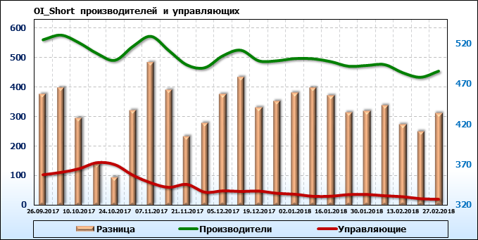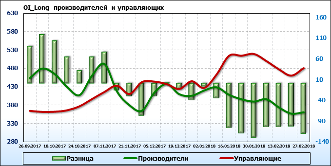 За прошедшую неделю разница между OI производителей и OI управляющих выросла на 13 125 контрактов. Разница между длинными позициями производителей и управляющих сократилась на 16 721 контракт. Разница между короткими позициями производителей и управляющих выросла на 22 364 контракта.