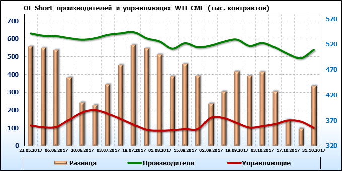 За прошедшую неделю разница между OI производителей и OI управляющих выросла на 48 495 контрактов. Разница между длинными позициями производителей и управляющих выросла на 32 960 контрактов. Разница между короткими позициями производителей и управляющих выросла на 82 980 контрактов.