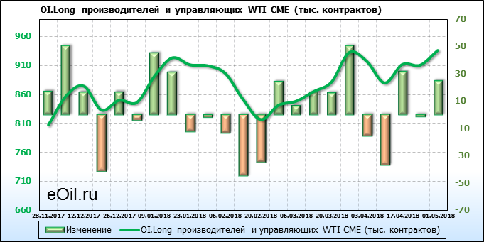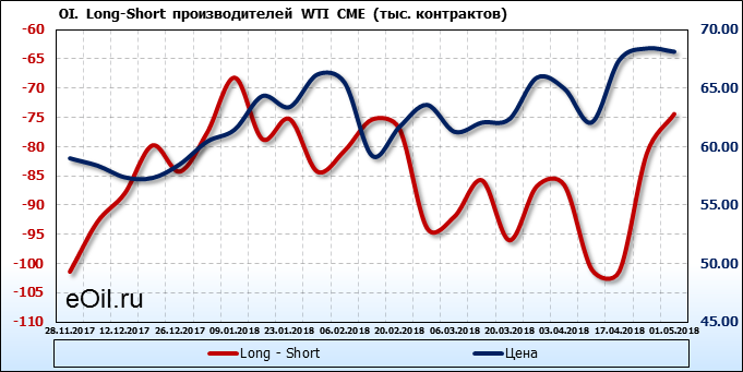 За прошлую неделю, 23.04.18 — 27.04.18, разница между длинными и короткими позициями производителей выросла на 7 тыс. контрактов. В тоже время, цена упала на 0.28 доллара. Производители перестали наращивать короткие позиции, что говорит или о непривлекательности текущих ценовых уровней для хеджирования, или о том, что часть участников рынка заняла выжидательную позицию.