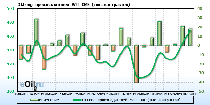 За прошлую неделю, 25.09.19 — 01.10.19, разница между длинными и короткими позициями производителей выросла на 3 тыс. контрактов. В тоже время, цена упала на 3.83 доллара. Производители перестали наращивать короткие позиции, что говорит или о непривлекательности текущих ценовых уровней для хеджирования, или о том, что часть участников рынка заняла выжидательную позицию.