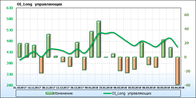 Открытый интерес управляющих активами без учета объема торговцев занимающих противоположные позиции по фьючерсным контрактам с разной датой экспирации упал на 20 тысяч контрактов. Объем контрактов, направленных как правило на спекуляции, составляет 1038085 штук. Деньги управляющих в течение прошлой недели уходили с рынка не видя привлекательности в текущей ситуации.