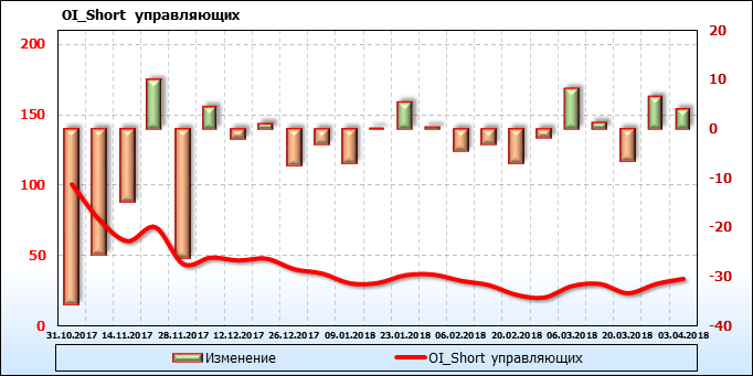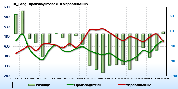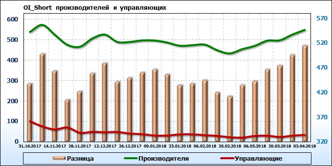 За прошедшую неделю разница между OI производителей и OI управляющих выросла на 66651 контрактов. Разница между длинными позициями производителей и управляющих выросла на 61972 контрактов. Разница между короткими позициями производителей и управляющих выросла на 18819 контрактов.