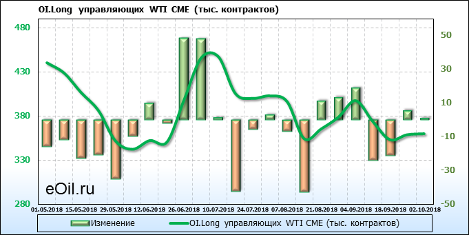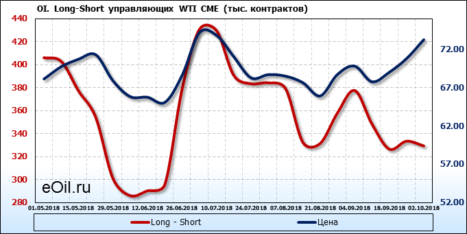 За прошлую неделю, 24.09.18 — 28.09.18, разница между длинными и короткими позициями управляющих упала на 4 тыс. контрактов. В тоже время, цена выросла на 2.47 доллара. Управляющие не горят желанием покупать, что заставляет нас рассуждать о потери доверия к тенденции со стороны быков — спекулянтов. Рынок становится более тонким. Без прихода свежих объемов толкать цену вверх скоро будет некому.