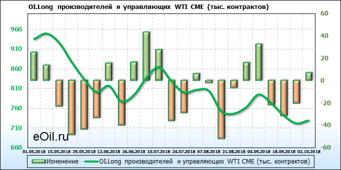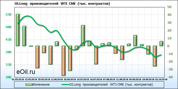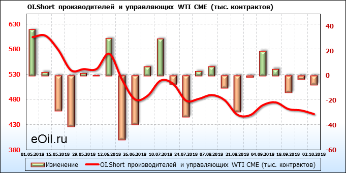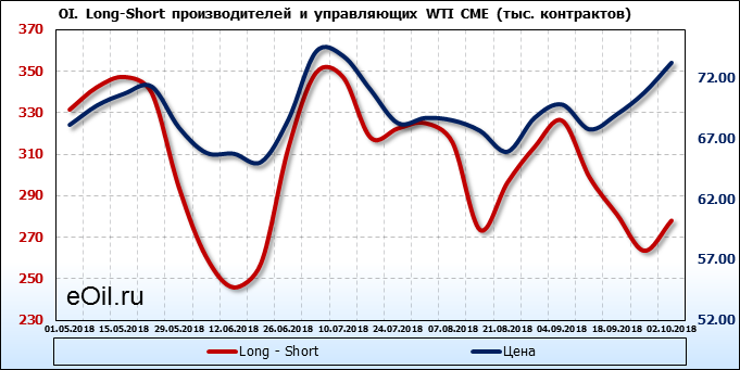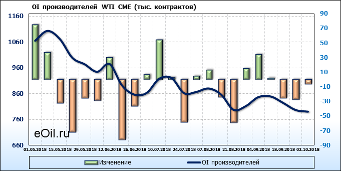 За прошлую неделю, 24.09.18 — 28.09.18, разница между длинными и короткими позициями производителей выросла на 19 тыс. контрактов. В тоже время, цена выросла на 2.47 доллара. Производители не торопятся наращивать продажи, предполагая, что возможен рост цены в ближайшее время.