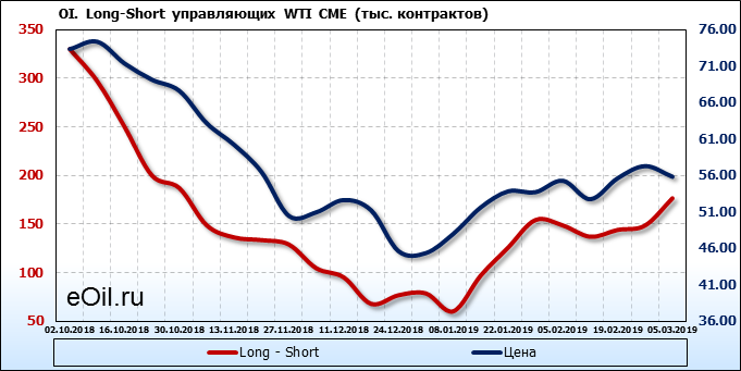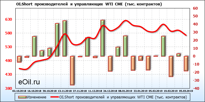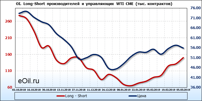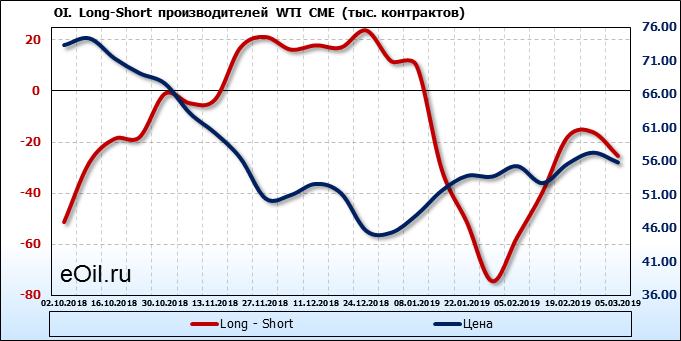 За прошлую неделю, 27.02.19 — 05.03.19, разница между длинными и короткими позициями производителей упала на 9 тыс. контрактов. В тоже время, цена упала на 1.46 доллара. Производители наращивают короткие позиции, что не дает цене расти. В такой ситуации на рынке возможно ускорение падения цен.