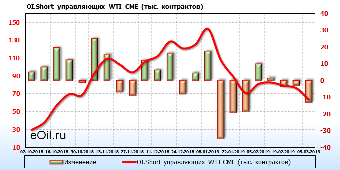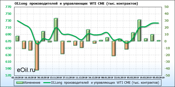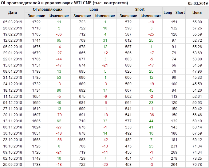 За прошлую неделю, 27.02.19 — 05.03.19, разница между длинными и короткими позициями производителей и управляющих выросла на 19 тыс. контрактов. За отчетный период времени, цена упала на 1.46 доллара. Производители и управляющие в своей совокупности смотрели вверх, не смотря на то что цена продолжала снижаться. Подобный дисбаланс должен привести к стабилизации и развороту цен вверх в скором времени.