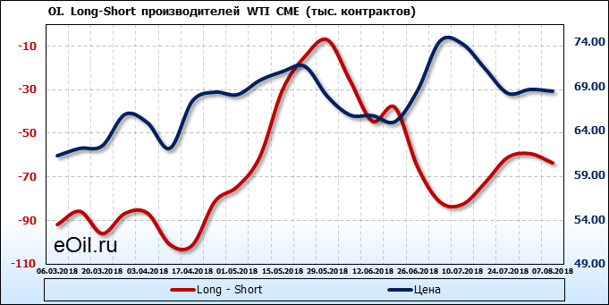 За прошлую неделю, 30.07.18 — 03.08.18, разница между длинными и короткими позициями производителей упала на 4 тыс. контрактов. В тоже время, цена упала на 0.2 доллара. Производители наращивают короткие позиции, что не дает цене расти. В такой ситуации на рынке возможно ускорение падения цен.