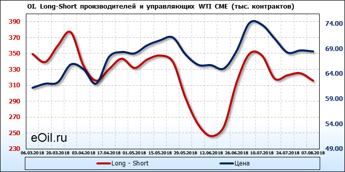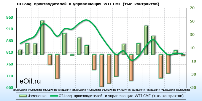 За прошлую неделю, 30.07.18 — 03.08.18, разница между длинными и короткими позициями производителей и управляющих упала на 9 тыс. контрактов. За отчетный период времени, цена упала на 0.2 доллара. Производители и управляющие на отчетной недели были склонны продавать. Суммарное число шортов было выше суммарного числа лонгов. Цены также снижаются, что создает привлекательные условия для продавцов в среднесрочной перспективе, одна — две недели.
