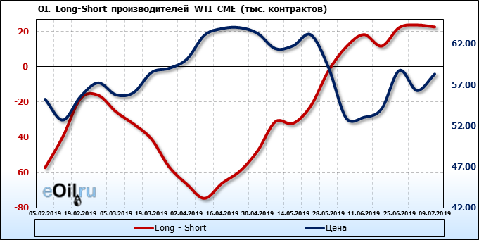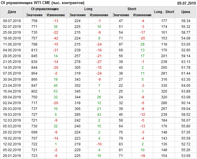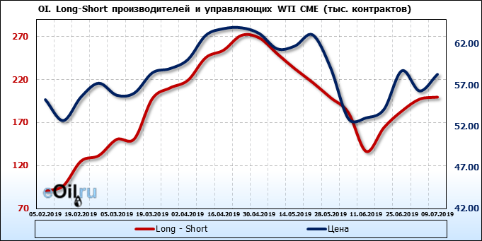 За прошлую неделю, 03.07.19 — 09.07.19, разница между длинными и короткими позициями управляющих выросла на 3 тыс. контрактов. В тоже время, цена выросла на 2.02 доллара. Управляющие наращивают позиции, разгоняя тем самым рост цен, что говорит нам о текущей силе рынка.