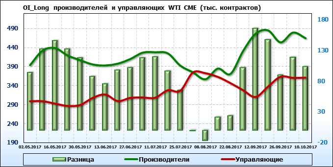 За прошедшую неделю разница между OI производителей и OI управляющих сократилась на 36 803 контрактов. Разница между длинными позициями производителей и управляющих сократилась на 15 364 контрактов. Разница между короткими позициями производителей и управляющих сократилась на 37 944 контрактов.