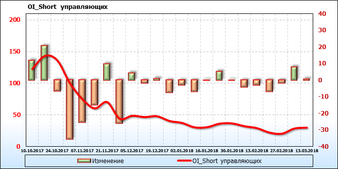 Открытый интерес управляющих активами без учета объема торговцев занимающих противоположные позиции по фьючерсным контрактам с разной датой экспирации упал на 57 тысяч контрактов. Объем контрактов, направленных как правило на спекуляции, составляет 978573 штук. Деньги управляющих в течение прошлой недели уходили с рынка не видя привлекательности в текущей ситуации.