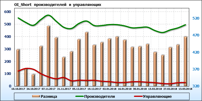 За прошедшую неделю разница между OI производителей и OI управляющих выросла на 114494 контрактов. Разница между длинными позициями производителей и управляющих выросла на 46020 контрактов. Разница между короткими позициями производителей и управляющих выросла на 23957 контрактов.