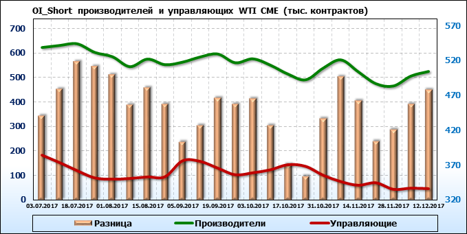 За прошедшую неделю разница между OI производителей и OI управляющих выросла на 50 629 контрактов. Разница между длинными позициями производителей и управляющих выросла на 31 047 контрактов. Разница между короткими позициями производителей и управляющих выросла на 21 108 контрактов.