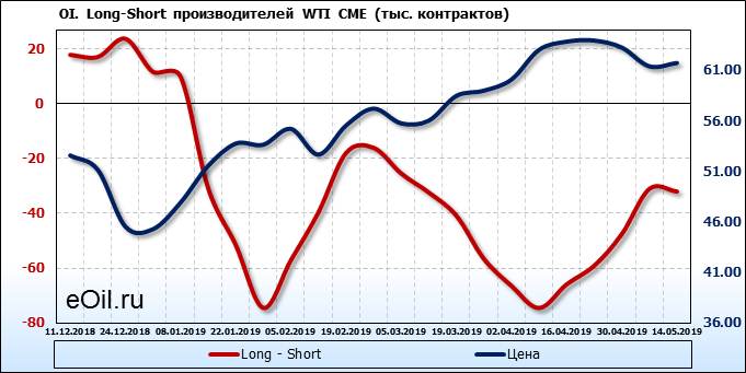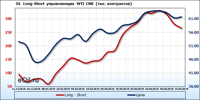 За прошлую неделю, 08.05.19 — 14.05.19, разница между длинными и короткими позициями управляющих упала на 17 тыс. контрактов. В тоже время, цена выросла на 0.34 доллара. Управляющие не горят желанием покупать, что заставляет нас рассуждать о потери доверия к тенденции со стороны быков — спекулянтов. Рынок становится более тонким. Без прихода свежих объемов, толкать цену вверх скоро будет некому.