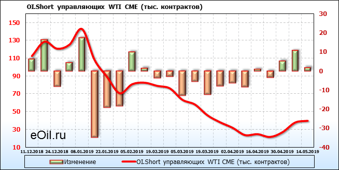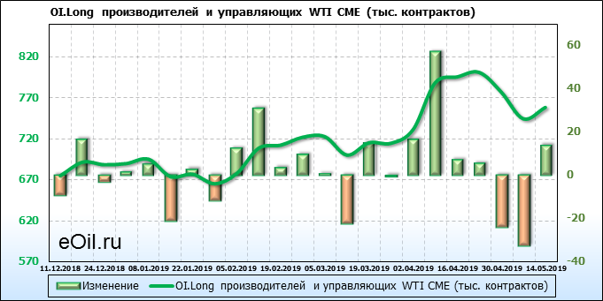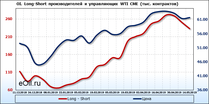 За прошлую неделю, 08.05.19 — 14.05.19, разница между длинными и короткими позициями производителей и управляющих упала на 18 тыс. контрактов. За отчетный период времени, цена выросла на 0.34 доллара. Разница совокупного объема длинных и коротких позиций производителей и управляющих на прошедшей неделе снизилась, в то время как цены выросли. Рынок теряет доверие покупателей, что, при продолжении данной динамики, приведет к стабилизации или падению цен в ближайшее время.