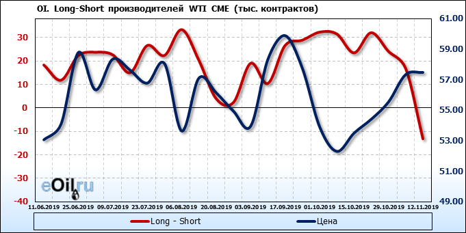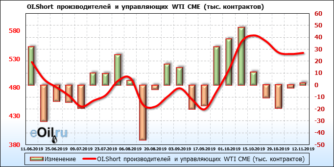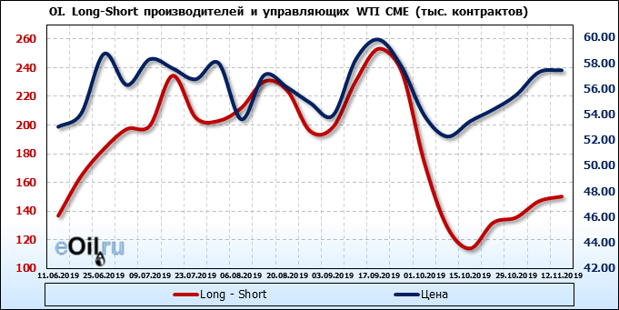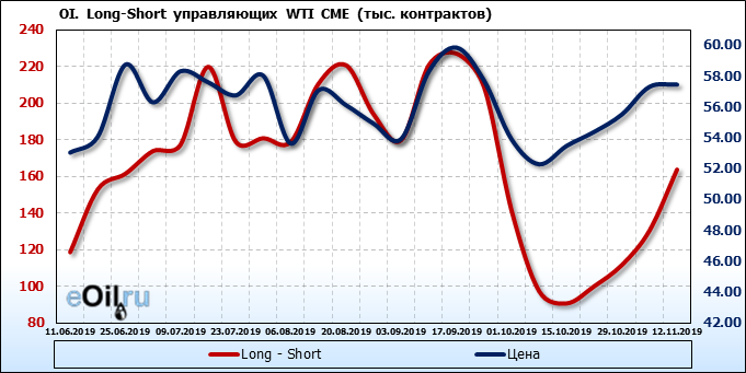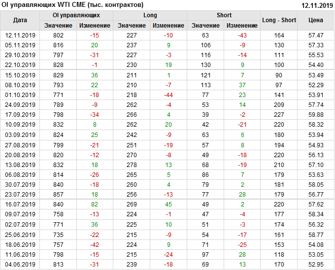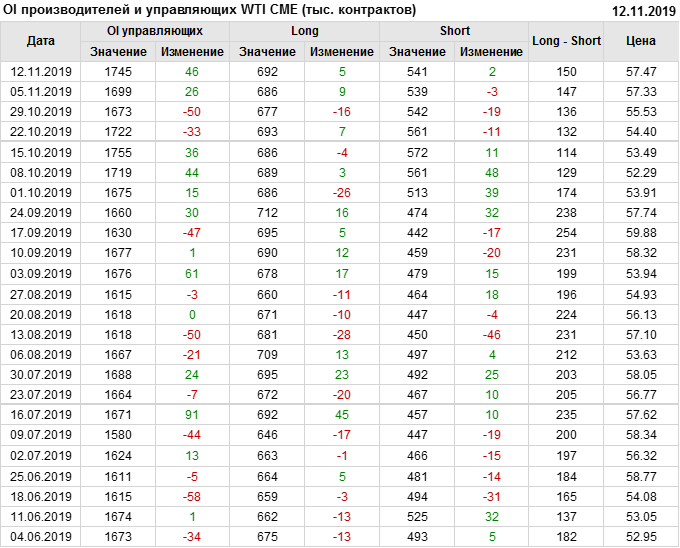 За прошлую неделю, 06.11.19 — 12.11.19, разница между длинными и короткими позициями управляющих выросла на 33 тыс. контрактов. В тоже время, цена выросла на 0.14 доллара. Управляющие наращивают позиции, разгоняя тем самым рост цен, что говорит нам о текущей силе рынка.