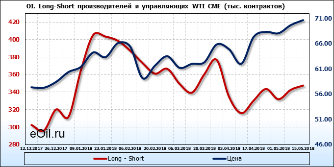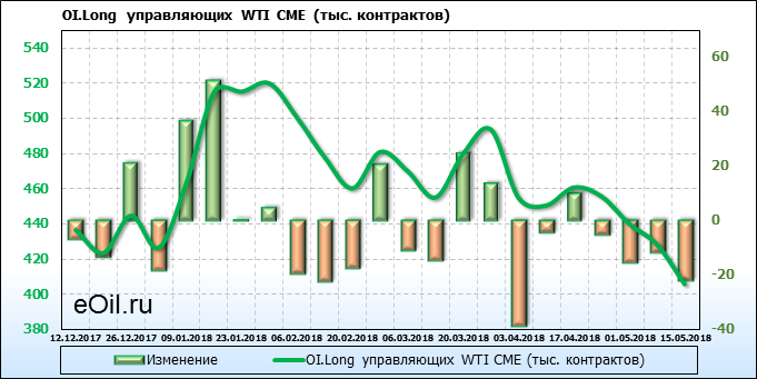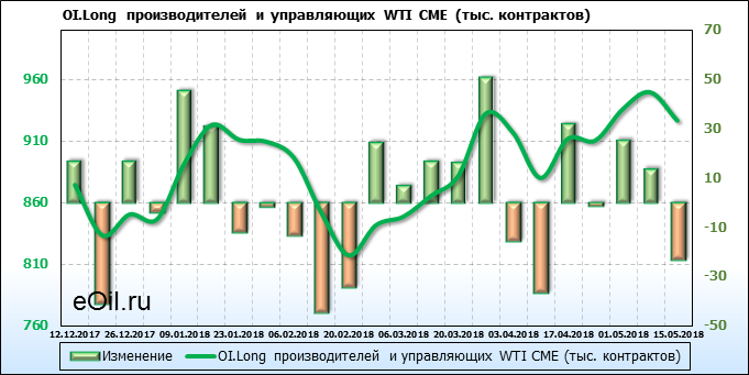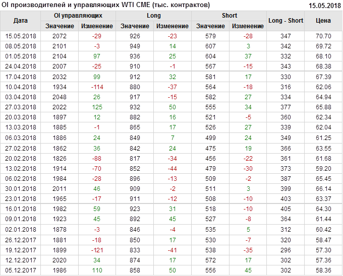 За прошлую неделю, 07.05.18 — 11.05.18, разница между длинными и короткими позициями управляющих упала на 26 тыс. контрактов. В тоже время, цена выросла на 0.98 доллара. Управляющие не горят желанием покупать, что заставляет нас рассуждать о потери доверия к тенденции со стороны быков — спекулянтов. Рынок становится более тонким. Без прихода свежих объемов, толкать цену вверх скоро будет некому.