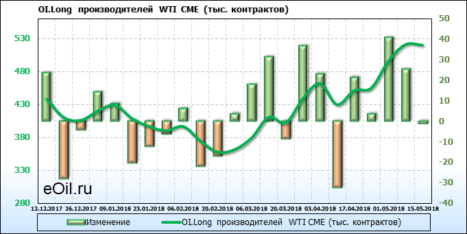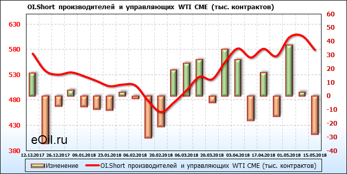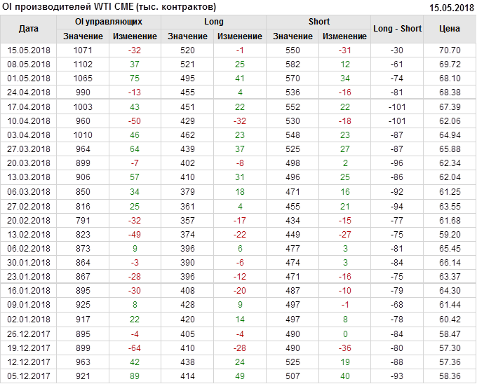 За прошлую неделю, 07.05.18 — 11.05.18, разница между длинными и короткими позициями производителей выросла на 31 тыс. контрактов. В тоже время, цена выросла на 0.98 доллара. Производители не торопятся наращивать продажи, предполагая, что возможен рост цены в ближайшее время.